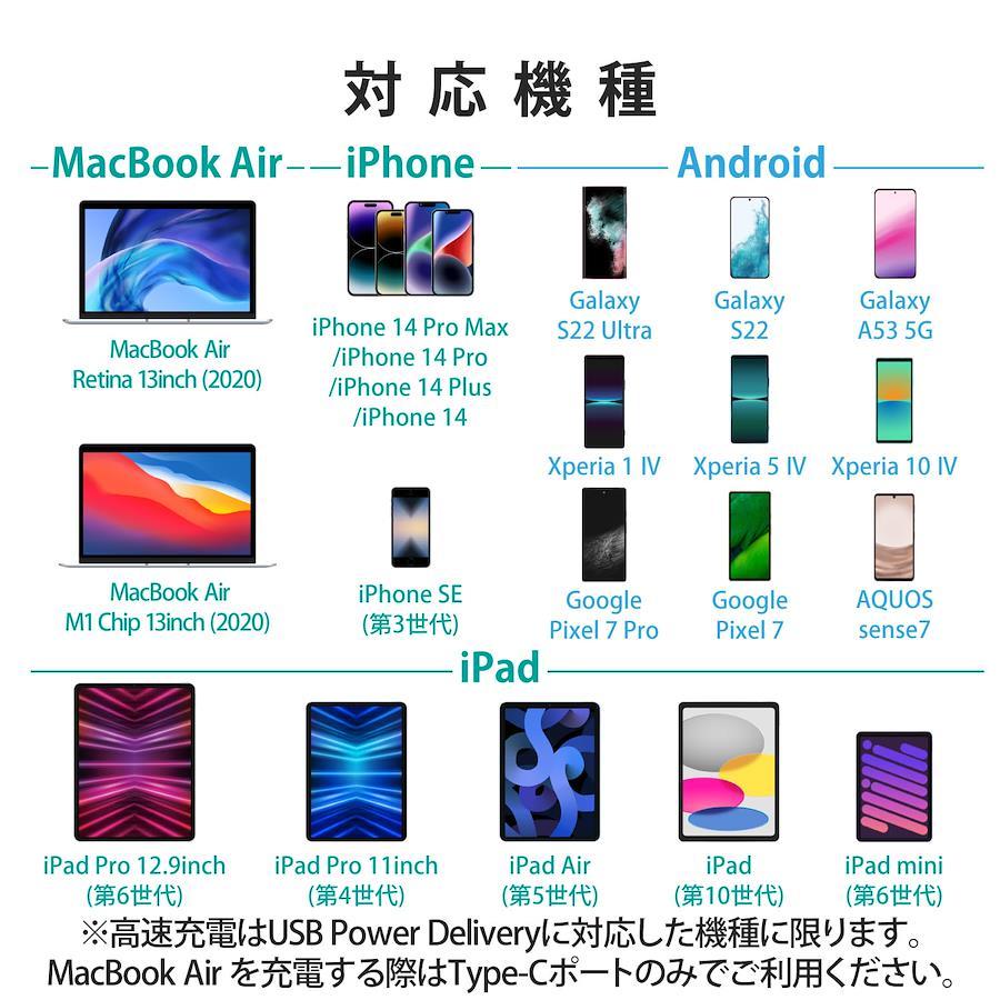 【スペック】30W(USB-Cポートのみ使用)、2ポート(USB-C/USB-A)、サイズ:幅4.2×厚み3×高さ3.9cm、重量:58g【ノートPC対応機種】Macbook Air、Pro 13インチ、Pro 16インチ、Surface Pro8、GO3、Laptop4、Laptop Go2 など、USB-Cポートから30Wの規格内で充電が可能な機器GaN(窒化ガリウム)を採用した小型で軽量、かつ高出力なUSB AC充電器です。GaN(窒化ガリウム)とは従来のシリコンと比べると発熱を抑える事が出来る新材料で、製品の小型化及び軽量化が可能となりました。端末に応じて出力が5V/3A、9V/3A、15V/2A、20V/1.5Aと可変し、iPhoneなどのスマートフォンから、iPad Airなどタブレット端末、MacBook Airなどのノートパソコンまで幅広く高速充電できます。耐トラッキング性の要求事項(PSE:電気用品安全法)を満たしたコンセントプラグを採用しています。