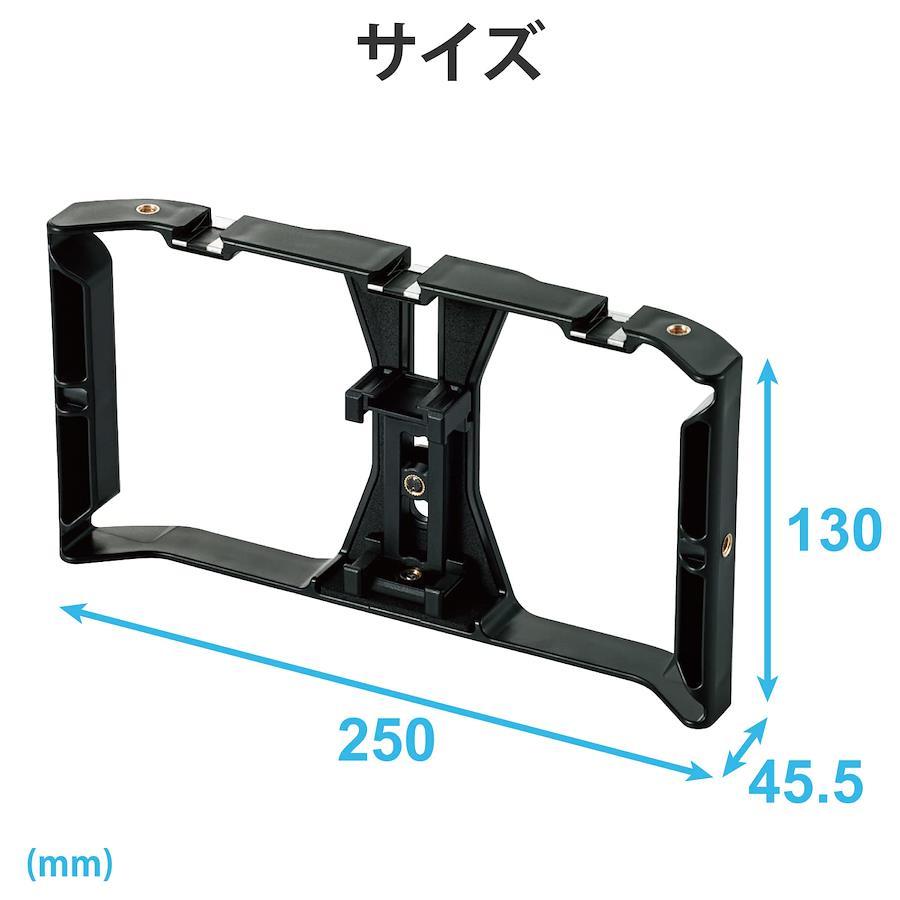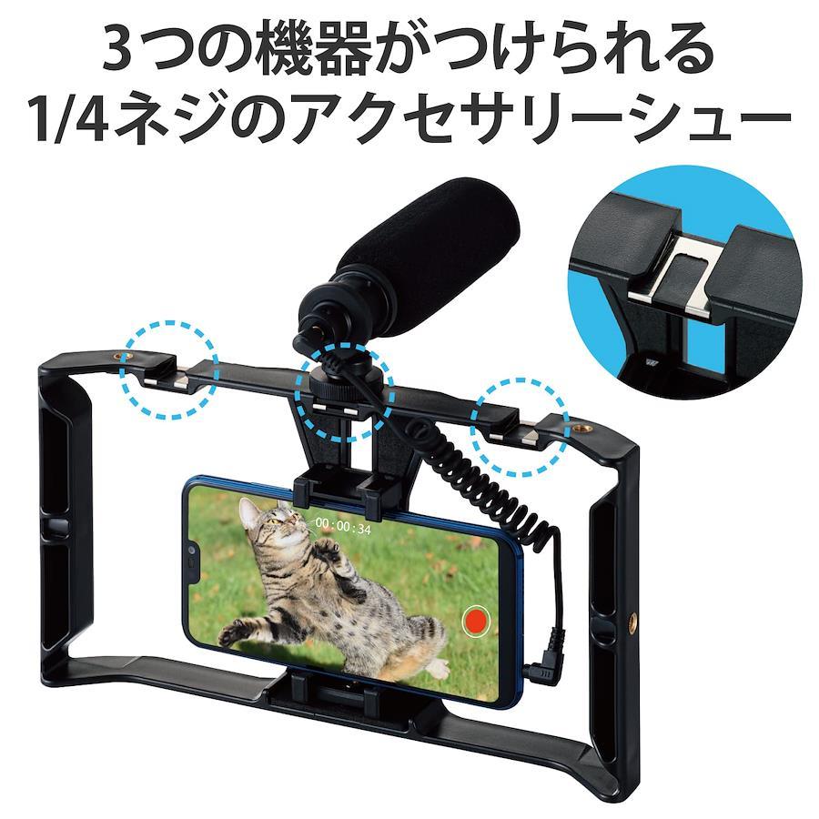■カメラやライト、マイクなどの撮影機材をカスタマイズして装着できる、動画撮影用スマートフォンホルダーです。