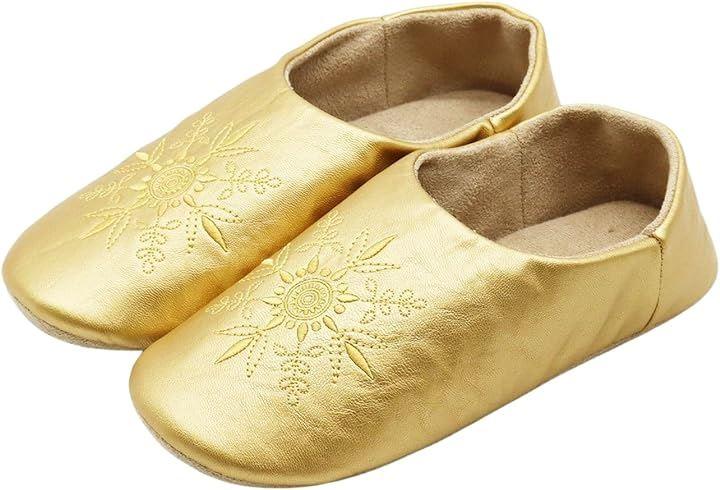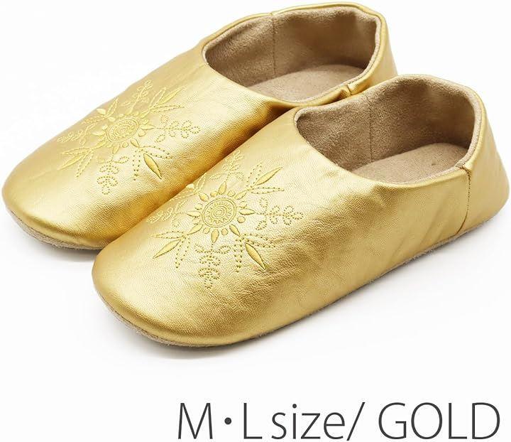 ・バブーシュはもともと寺院に入るときに着用する伝統的な履き物で、メタリックな風合いにモロッコ風の刺繍を施した、カジュアルタイプのルームシューズ。