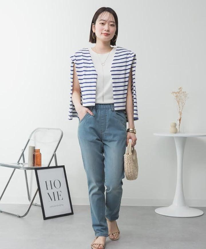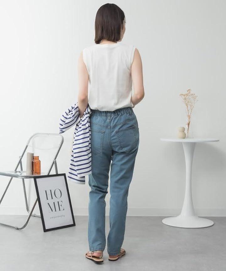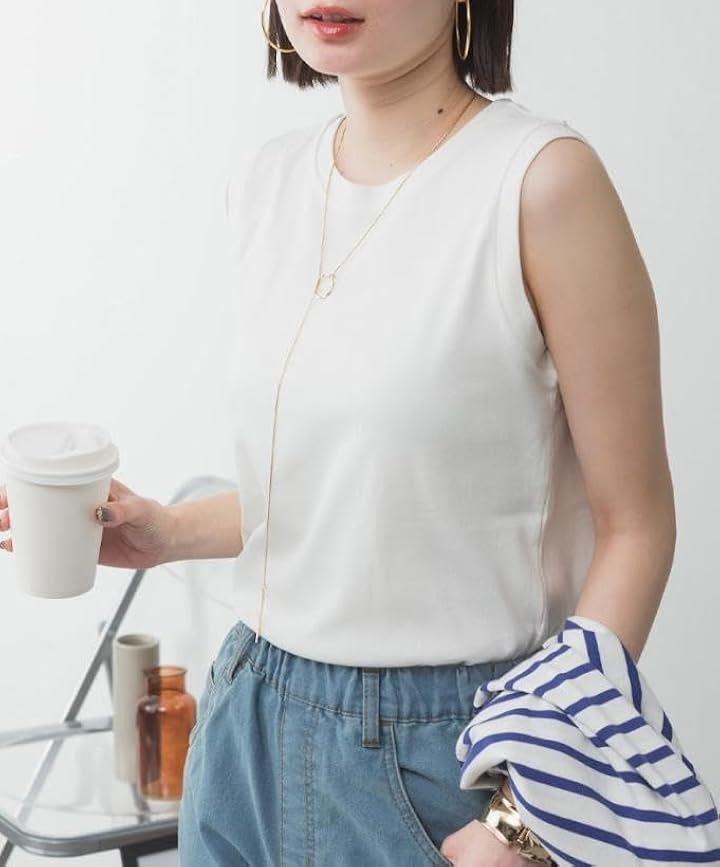 ノースリーブの肩幅のシルエットがシンプルなのにおしゃれに見せ、二の腕も細く見せてくれるデザイン。