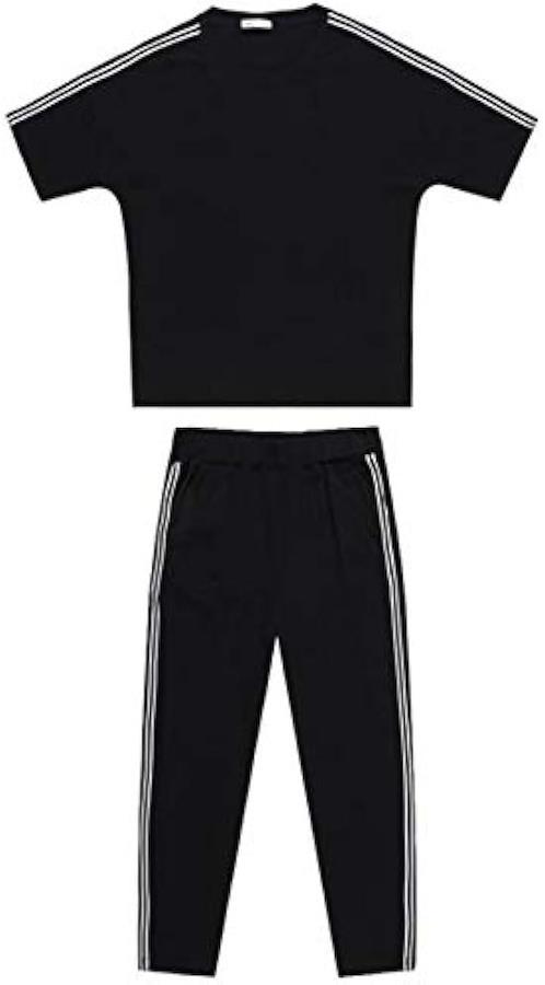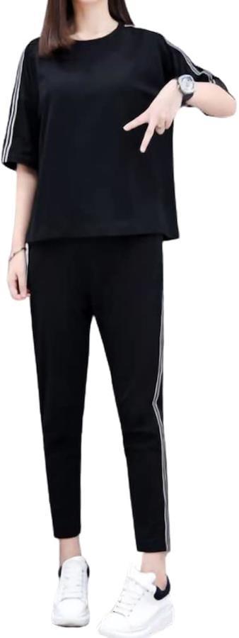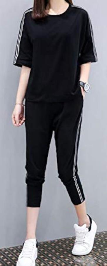 トップスの肩口とパンツのサイドにトレンドのダブルラインが入ったスタンダードなアイテム。