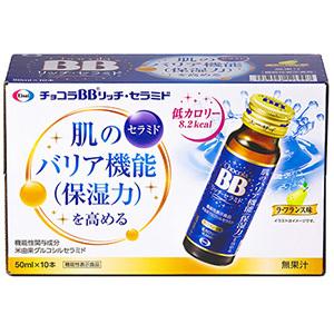 ■商品概要メーカー:エーザイ商品名:【軽】チョコラBB リッチセラミド(50mL×10本)区分:食品内容量:50mL×10本商品概要:【機能性表示食品】セラミドでお肌に潤い!JANコード:4987028126447商品コード:051505373■商品の特徴機能性表示食品のセラミド配合ドリンク。潤い成分米由来グルコシルセラミド1800μgに加え、美容にうれしいコラーゲン、ヒアルロン酸、 ビタミンB6等も配合しました。肌の潤いを守りたい方、肌が乾燥しがちな方におすすめです。■機能性関与成分米由来グルコシルセラミド1800μg届出表示:本品には米由来グルコシルセラミドが含まれます。米由来グルコシルセラミドには、肌の潤いを逃しにくくする機能があることが報告されています。肌が乾燥しがちな方に適した食品です。・届出番号:B60・食生活は、主食、主菜、副菜を基本に、食事のバランスを。・本品は、疾病の診断、治療、予防を目的としたものではありません。[成分に関する注意]●本品は、特定保健用食品とは異なり、消費者庁長官による個別審査を受けたものではありません。■原材料/成分/素材/材質コラーゲンペプチド(ゼラチンを含む)、エリスリトール、果糖、はちみつ、米胚芽抽出物、ヒアルロン酸/酸味料、香料、保存料(安息香酸Na)、ナイアシン、甘味料(スクラロース、アセスルファムK)、V.B6■栄養成分栄養成分(1瓶50ml当たり)エネルギー:8.2kcal、たんぱく質:1g、脂質:0g、炭水化物:2.1g、食塩相当量:0.02g、ナイアシン:12mg、ビタミンB6:1.1mg■賞味期限/使用期限(製造から)2年■使用方法/召し上がり方1日当たり1瓶を目安にお飲みください。[摂取方法に関連する注意]●本品は、多量摂取により疾病が治癒したり、より健康が増進するものではありません。■使用上の注意・直射日光や高温を避け、涼しいところに保存してください。・開栓後は、すぐにお飲みください。・びんはワレモノです。容器への衝撃、加温・冷凍はさけてください。・キャップの切り口や突起物でケガをしないようご注意ください。・成分により沈殿することがありますが、品質には問題ありません。よく振ってからお飲みください。・小児の手の届かないところに保存してください。■メーカー希望小売価格(税込)3218円■発売元/製造元/輸入元エーザイ■お問い合わせ先セルフケア製品(ドラッグストア・薬局等で購入する製品)について0120-161-454(平日 9:00~18:00、土日・祝日 9:00~17:00、365日対応)