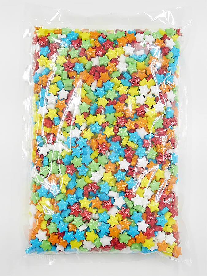 [■重量/1個 約0.9g ■原産国/カナダ ■サイズ/(直径)約1.2cm (横)約0.4cm]カラフルでほのかに甘い星型のラムネです。おやつとしてご好評いただいております。個人での利用はもちろんのこと、小袋に入れてイベント・パーティー・ブライダルなどのプチギフトとして使ったり、オフィスでの休憩のアイテムとして使ったり、業務用アイテムとして使ったり・・・様々なシーンでお使いいただいております。
