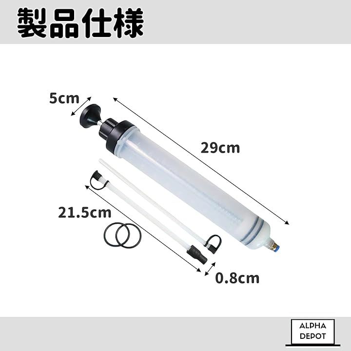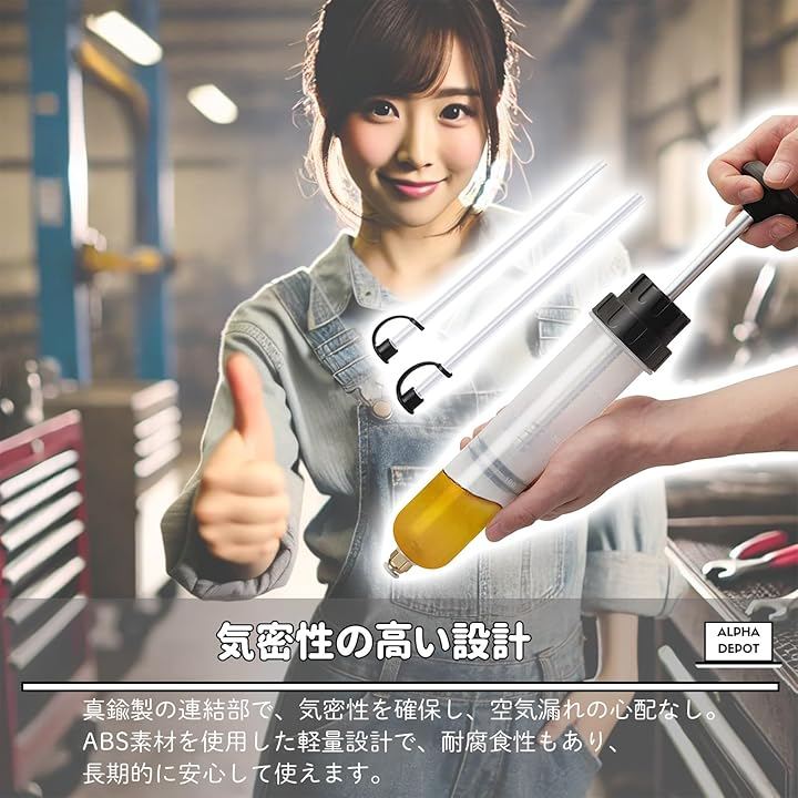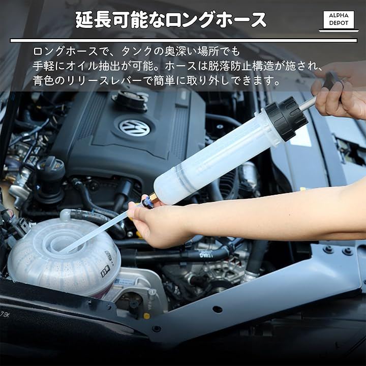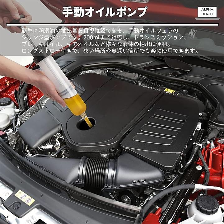 200mlまで対応し、トランスミッション、ブレーキオイル、ギアオイルなど様々な液体の抽出に便利。