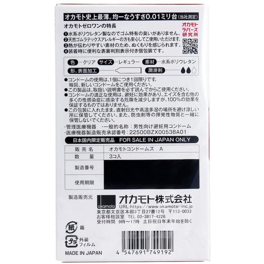 〇商品説明日本の0.01ミリ!薄さを感じる!オカモトのコンドーム「001(オカモトゼロワン)」は、その名のとおり厚さ0.01ミリ台のコンドームです。●驚くほどのやわらかさに加え、装着時の締め付け感がありません。●パートナーのぬくもりや感触をそのままに伝えてくれて、二人の仲もさらにぐっと近づきます。●製品に350mLの水を入れる実験では、従来品の002(ゼロツー)と比べ、2倍近く伸び、それだけ柔らかく、使用感が少ないということを表しています。●水系ポリウレタン製なのでゴム特有の臭いがありません。●天然ゴムラテックスアレルギーの方も安心してご使用いただけます。●熱が伝わりやすい素材のため、ぬくもりを感じられます。●装着時に便利な裏表判別表示付き個包装です。