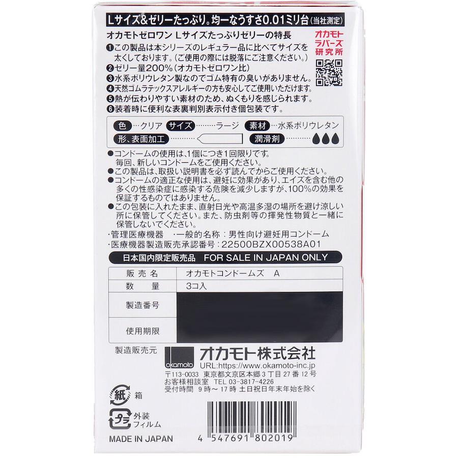厚さ0.01ミリ台のコンドーム。驚くほどのやわらかさ、装着時の締め付け感なし。●うるおい感を追求して高粘度ゼリーを配合した潤滑剤を使用。従来のオカモトゼロワンに比べ、2倍の潤滑剤量を塗布しました。●均一なうすさ0.01ミリ台の水系ポリウレタン製なのでゴム特有の臭いがありません。●天然ゴムラテックスアレルギーの方も安心してご使用いただけます。●熱が伝わりやすい素材のため、ぬくもりを感じられます。●装着時に便利な表裏判別表示付き個包装です。●この製品は本シリーズのレギュラー品に比べてサイズを太くしております。ご使用の際には脱落にご注意ください。