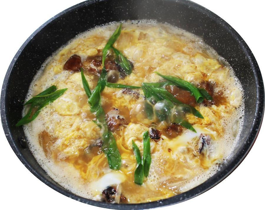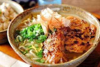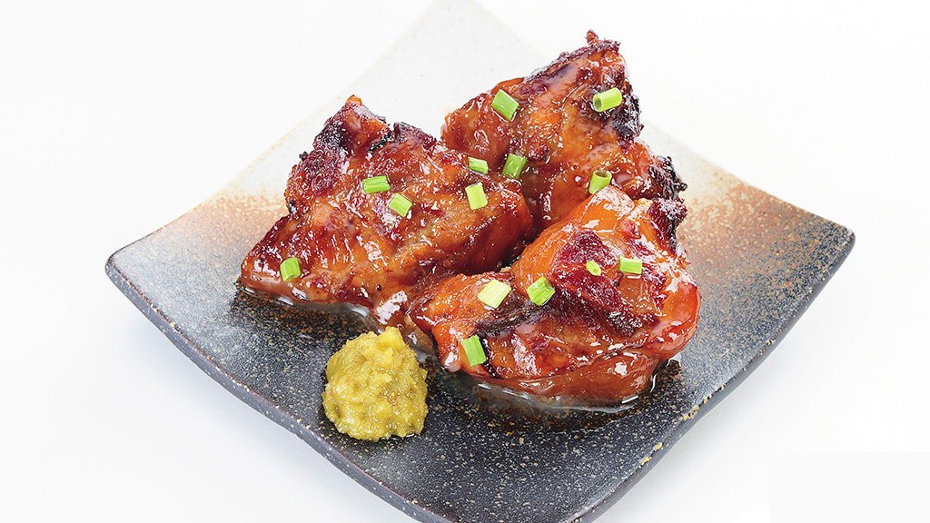 軟骨まで食べられるほど柔らかく煮込んだ軟骨付豚バラ肉を醤油ベースで味付けし、仕上げに炙りを加えました。
