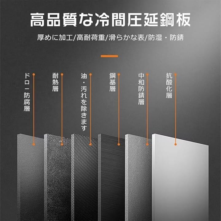 「プレミアム素材と仕上げ」優れた厚手の冷間圧延鋼板で作られ、高耐荷重、耐久性を持ち、水はじき、カビ・キズを付きにくい、腐食に強い;さらに、エコーな静音パウダースプレーで仕上げ、塗りはげにくい、カラフルの外観で繊細な手触りをする。
