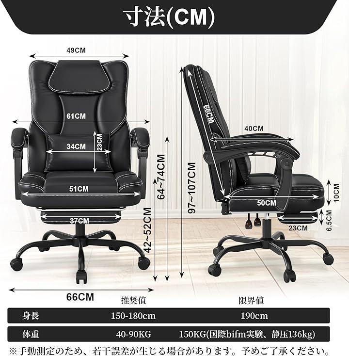 「155°リクライニング調節」このオフィスチェアは収納式フットレストを装備。