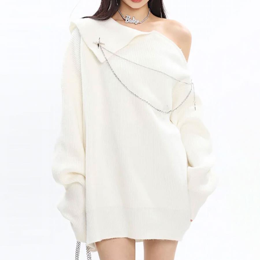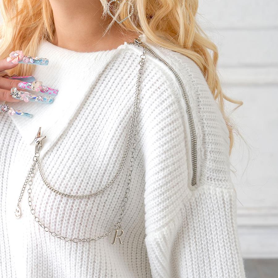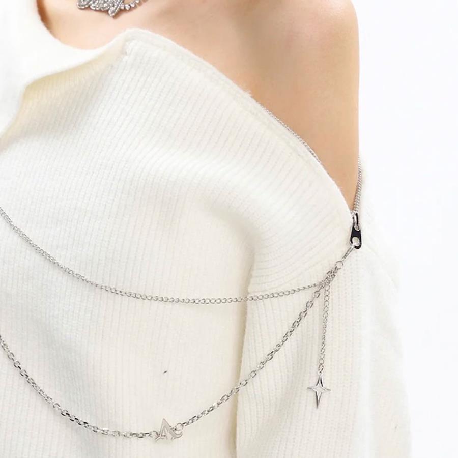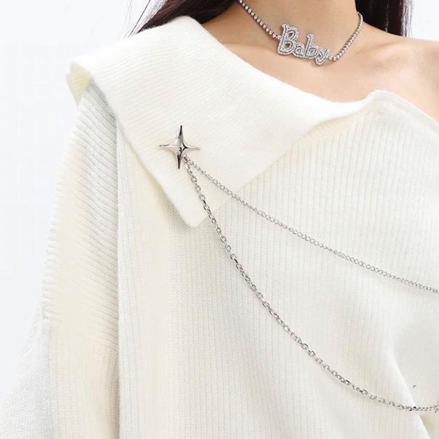 ・チェーンと星ブローチは好きな場所につけてグッと格上げコーデ。