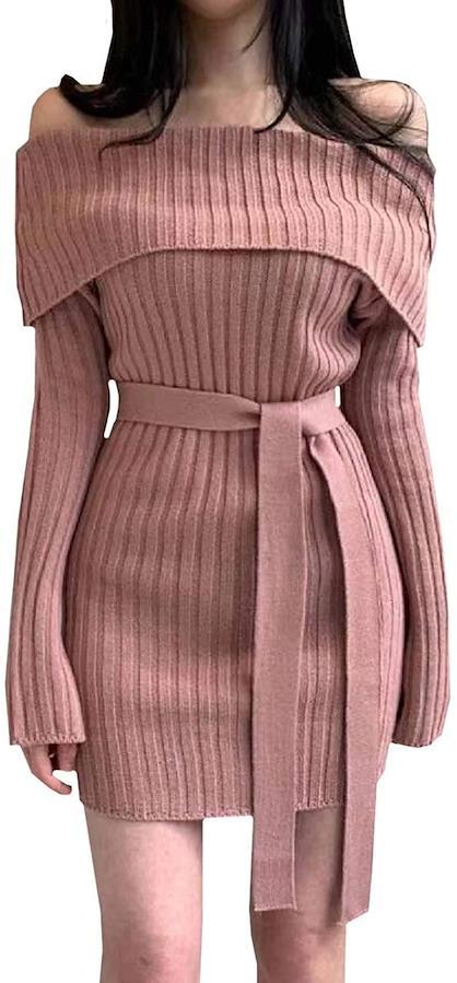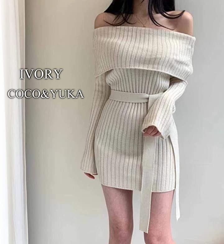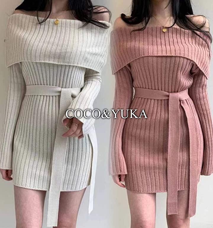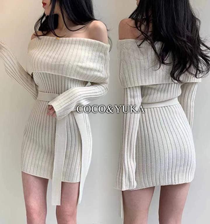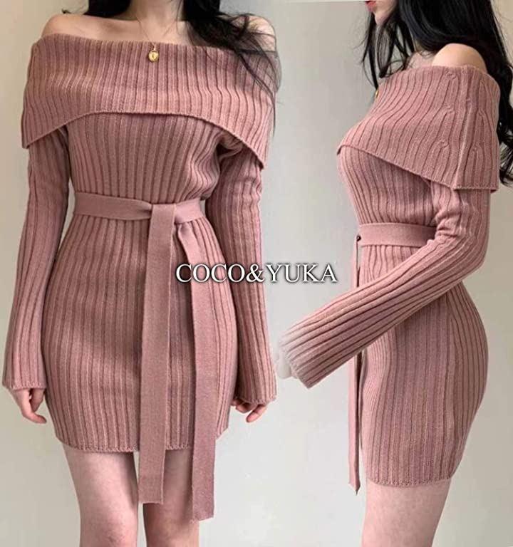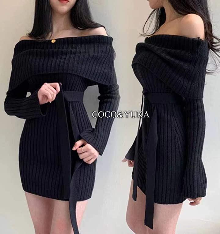・肩だし オフショルダー の かわいい タイト ワンピース です・ 長袖 リブニット で 冬 でも あたたかくいられます。