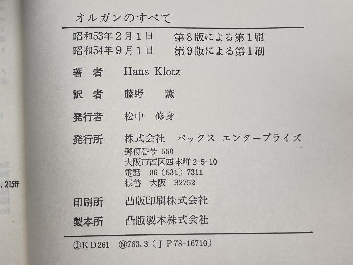 商品名:オルガンのすべて 改訂大増補 第9版 ハンス・クロッツ著 藤野薫訳 パックスエンタープライズ