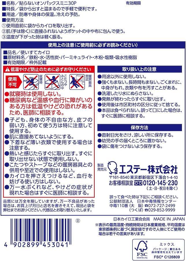 ●温かさが10時間持続します。 【ふんわり気持ちいい】長時間安定した温度が持続する、貼らないタイプのカイロです。 【手触りが良い】柔らかい不織布を使用しています。ポケットの中でもかさばりにくく、屋外での作業、スポーツ観戦レジャーにお使いいただけます。 【用途】使いすてカイロ 貼らないタイプ 防寒やお身体の保温。冷えの予防。低温作業時の保温など。 【スペック】最高温度:67℃ 平均温度:53℃ 持続時間:10時間(40℃以上を保持し、持続する時間) 【原産国】日本 【サイズ】ミニ(9cm×5.5cm)