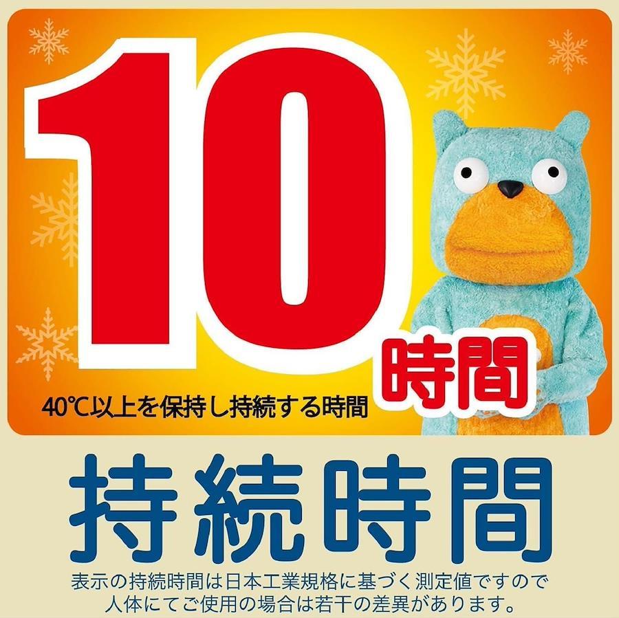 ●長時間安定した温度が持続する、貼るタイプのカイロです。 ●薄く、中身が均一で片寄らず、からだにぴったりフィットします。 ●温かさが10時間持続します。 【最後まで安定した温かさ】長時間安定した温度が持続する、貼るタイプのカイロです。 【衣類に貼るカイロ】防寒、からだの保温、冷えの予防、屋外でのスポーツ観戦レジャーにお使いください。 【からだにぴったりフィット】薄く、中身が均一で片寄りません。 【用途】 使いすてカイロ 貼るタイプ 【スペック】最高温度:63℃ 平均温度:51℃ 持続時間:10時間(40℃以上を保持し、持続する時間) 【原産国】日本 【内容量】40枚 【サイズ】ミニ(9.5cm×7cm)