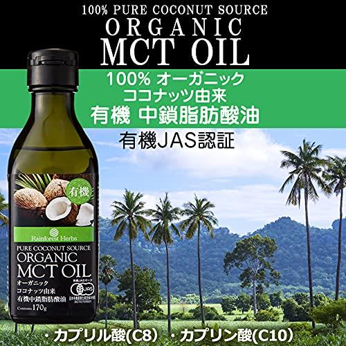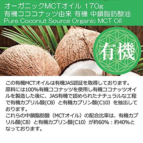 この有機MCTオイルは有機JAS認証を取得しております。 原料には100%有機ココナッツを使用し有機ココナッツオイルを製造した後に、JAS有機で認められたナチュラルな工程で有機カプリル酸(C8)と有機カプリン酸(C10)を抽出しております。 これらの中鎖脂肪酸(MCTオイル)の配合比率は、有機カプリル酸(C8)と有機カプリン酸(C10)が約60%:約40%となっております。