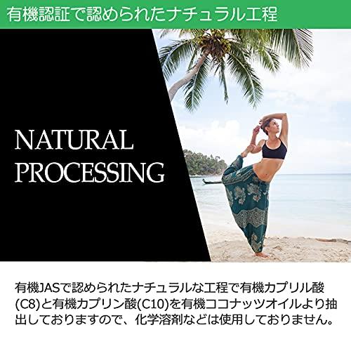 原料には100%有機ココナッツを使用し有機ココナッツオイルを製造した後に、JAS有機で認められたナチュラルな工程で有機カプリル酸(C8)と有機カプリン酸(C10)を抽出しております。