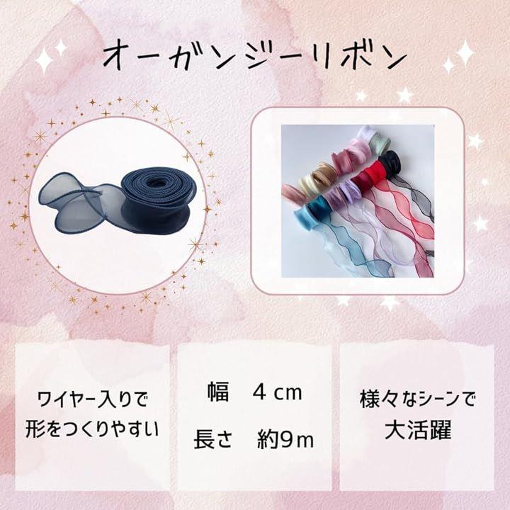 「KAZARI日和 オーガンジーリボン」は、幅4cm、長さ約9mのたっぷりサイズで、透け感が美しい高品質リボンです。