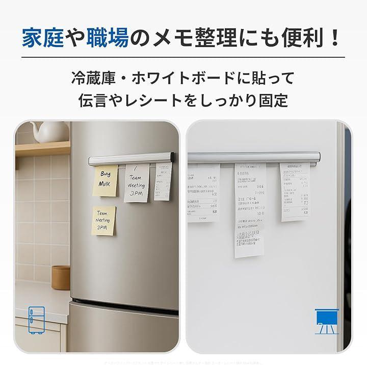 「幅広いシーンで活躍。冷蔵庫やホワイトボードにも」 マグネットテープ付きなので、厨房やオフィスの金属製の壁だけでなく、ご家庭の冷蔵庫やホワイトボードでもメモやレシピの固定に便利です。