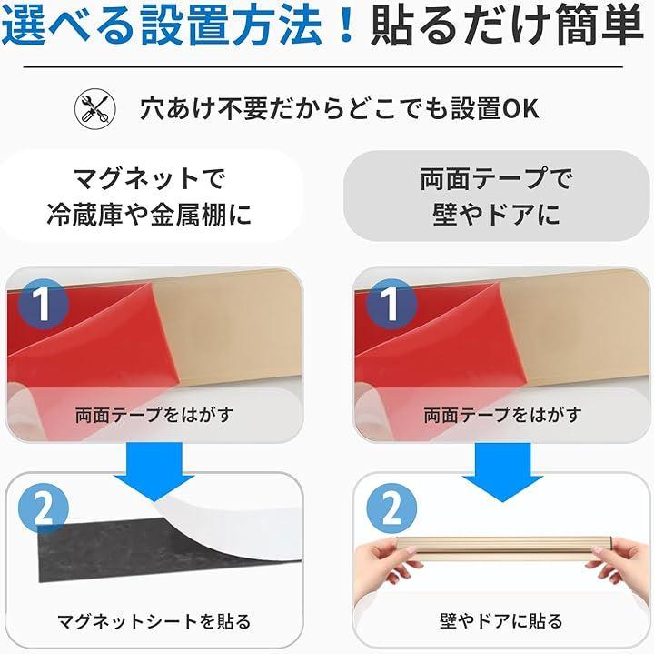 「両面テープORマグネットテープを選べる。簡単設置、多機能伝票ホルダー」 両面テープとマグネットテープ付きで、どちらか選んで、ピタッと貼るだけで簡単に設置できる伝票ホルダーです。