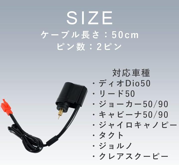 「商品詳細」本体1個、サイズ:ケーブル長さ50cm、ピン数:2ピン、対応車種:ディオDio50 AF18/27/28/34/35/56/57/62) リード50 AF20/48/HF05,ジョーカー50/90 AF42/HF09,キャビーナ50/90,ジャイロキャノピー X アップ TD01 TA01 TA02,タクト AF24 30 31,ジョルノ クレア スクーピー AF24 54 55,その他トライク、バギー,中華スクーター等GY6系50-200ccエンジン用