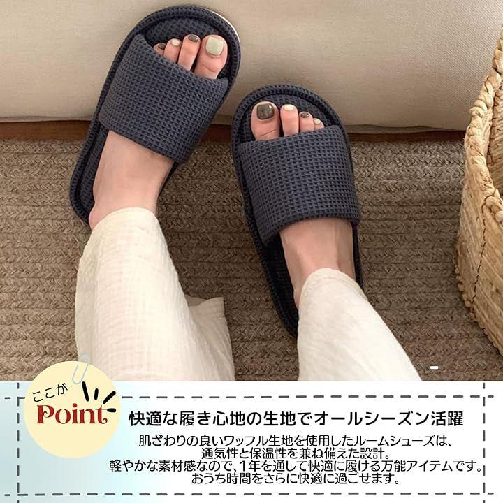 「快適な履き心地のワッフル生地でオールシーズン活躍」肌ざわりの良いワッフル生地を使用したルームシューズは、通気性と保温性を兼ね備えた設計。