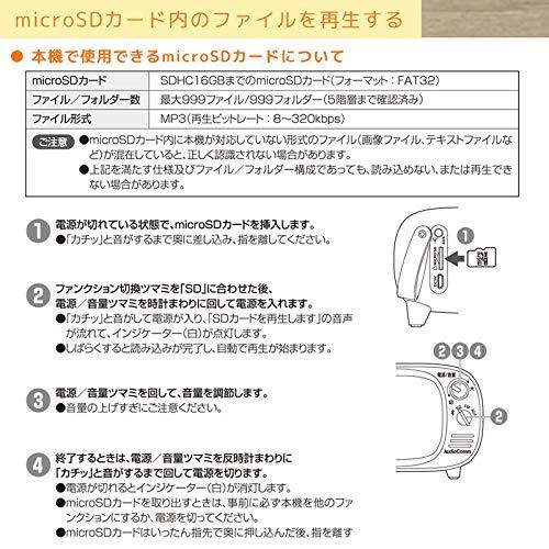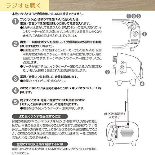 【 仕 様 】≪全般≫■ 電源:DC5V 500mA (USB給電:microUSB入力端子)■ 内蔵電池:充電式リチウムポリマー電池(3.7V 600mAh)■ スピーカー:口径52mm 3W×1 (4Ω)■ 接続端子:電源…microUSB、AUX(外部音声)入力(※着脱式FMロッドアンテナ接続兼用)…φ3.5mmステレオミニジャック、microUSBカードスロット■ 充電時間:約2時間(残量ゼロからフル充電まで)■ 連読使用可能時間:Bluetooth/約4時間、ラジオ/約3時間、microSDカード/約5時間、AUX(外部音声)入力/約6時間■ 許容動作温度:0~40℃■ 許容動作湿度:20~80%(結露なしにて)■ 外形寸法:幅105