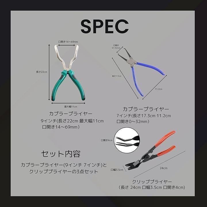 カプラープライヤー:9インチ(長さ22cm 最大幅11cm 口開き14~69mm)/ 7インチ(長さ17.3cm 11.2cm 口開き0~32mm)・クリッププライヤー(長さ 24cm 口幅3.5cm 口開き4cm)