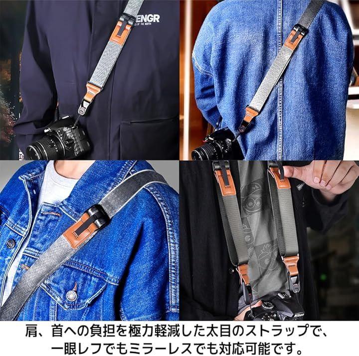 肩、首への負担を極力軽減した太目のストラップで、一眼レフでもミラーレスでも対応可能です。