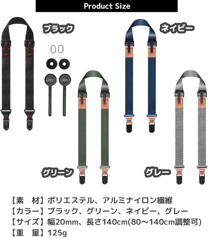 「素材」ポリエステル、アルミナイロン繊維「カラー」ブラック、グリーン、ネイビー、グレー「サイズ」幅20mm、長さ140cm(80~140cm調整可)「重量」125g