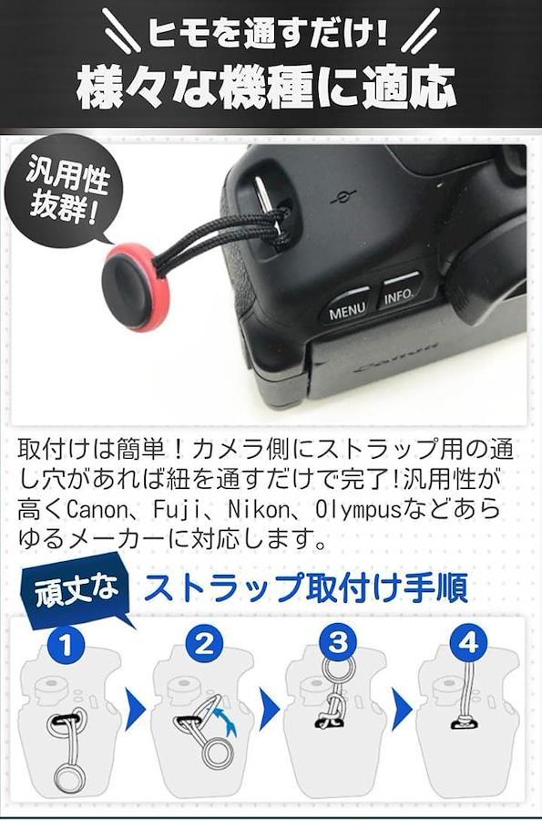 「様々な機種に適応」取付けは簡単。カメラ側にストラップ用の通し穴があれば紐を通すだけで完了.汎用性が高くCanon、Fuji、Nikon、Olympusなどあらゆるメーカーに対応します。