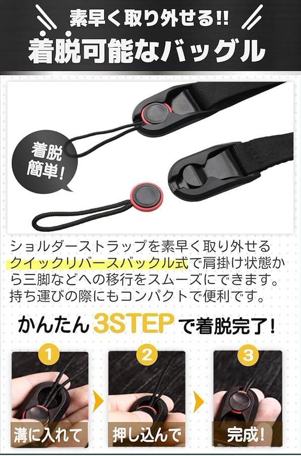 「着脱可能なバッグル」ショルダーストラップを素早く取り外せるクイックリバースバックル式で肩掛け状態から三脚などへの移行をスムーズにできます。