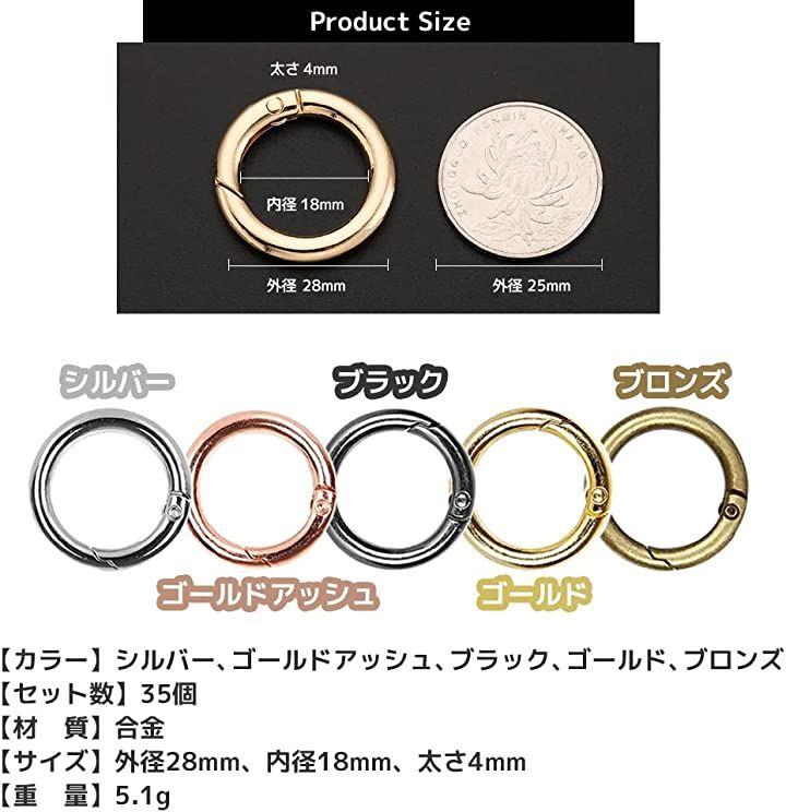 ・「カラー」シルバー、ゴールドアッシュ、ブラック、ゴールド、ブロンズ「セット数」35個「材質」合金「サイズ」外径28mm、内径18mm、太さ4mm「重量」5.1g