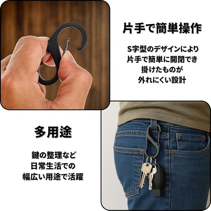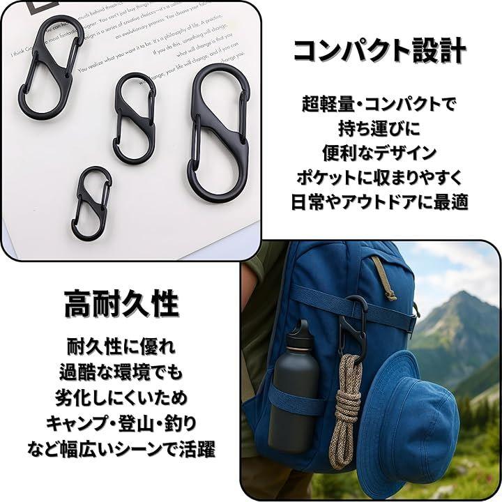 「持ち運びに便利なコンパクト設計」 このS字型カラビナは、超軽量でコンパクトなデザインが特徴です。