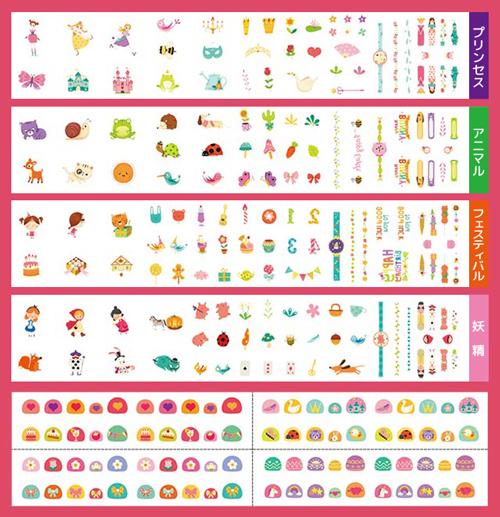 プリンセス・アニマル・フェスティバル・フェアリーテールの4種類とネイルシステッカーのセット。簡単に水で貼り付けられるのでおしゃれに楽しめます。