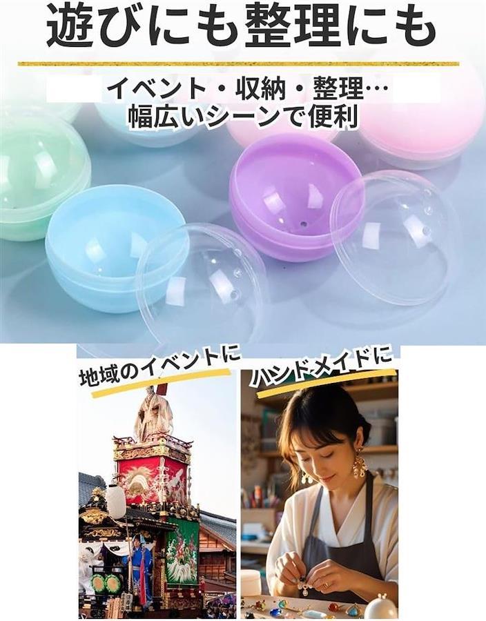 「イベント、ゲーム、収納など多彩な使い方」小型のマシン本体用カプセルとしてはもちろん、ビンゴやくじ引き、学園祭や地域イベント、子ども会などの景品入れにも便利です。