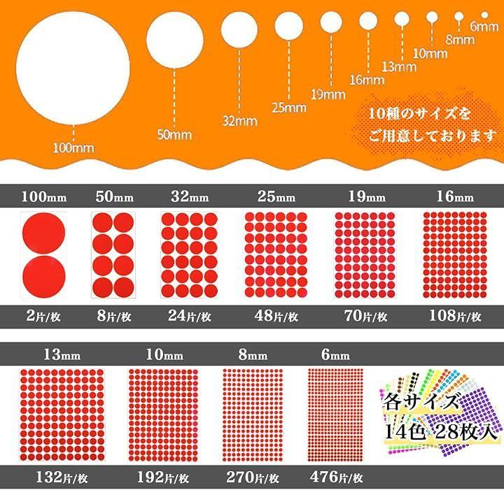 「商品内容」丸型カラーラベルシール:28枚入 カラー:14種(各2枚ずつ) 丸サイズ:直径13mm 1シート:132片 計3696片(28シート)