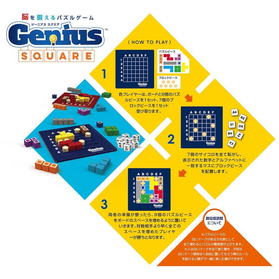 【遊び方】①各プレイヤーは、ベースと9個のパズル ピースのセットに加えて、7個のブロック ピースを受け取ります。 ②7個のサイコロを全て転がし、表示された7つの数字とアルファベットに一致するマスにブロック ピースを配置します。③両者の準備が整ったら、9個のパズル ピースをベースのスペースを埋めるように置いていきます。