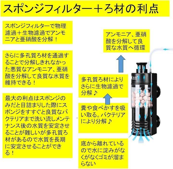 「スポンジフィルター+ろ材の利点 (1)」スポンジフィルターで物理濾過+生物濾過でアンモニアと亜硝酸を分解。