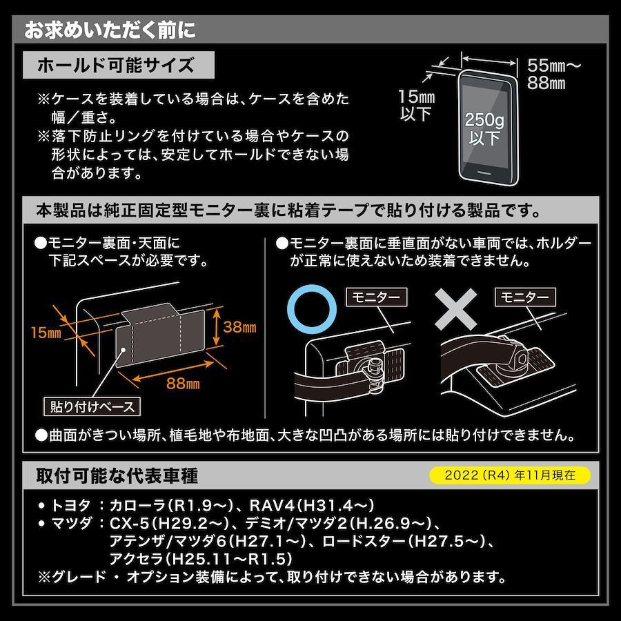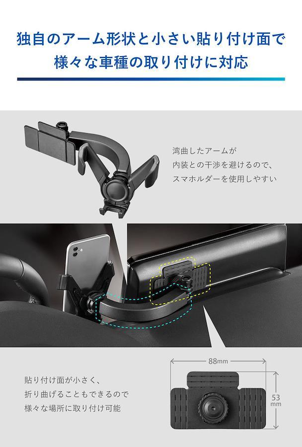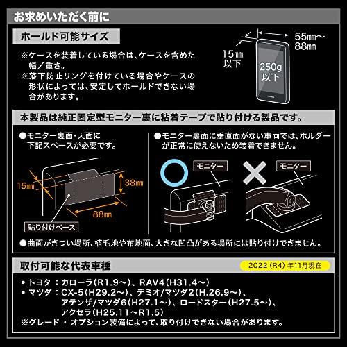 ●ダッシュボードがスッキリする取付位置・モニター裏に貼り付けるため貼り付け面が目立たず、車の内装デザインを損ないません。・88mm×53mmと小さい貼り付け面でもしっかりと固定します。・貼り付け面が小さいことでより多くの車種への取り付けを可能にしました。※本製品はモニター裏に粘着テープ(両面テープを製品に貼り付けたもの)で貼り付ける製品です。