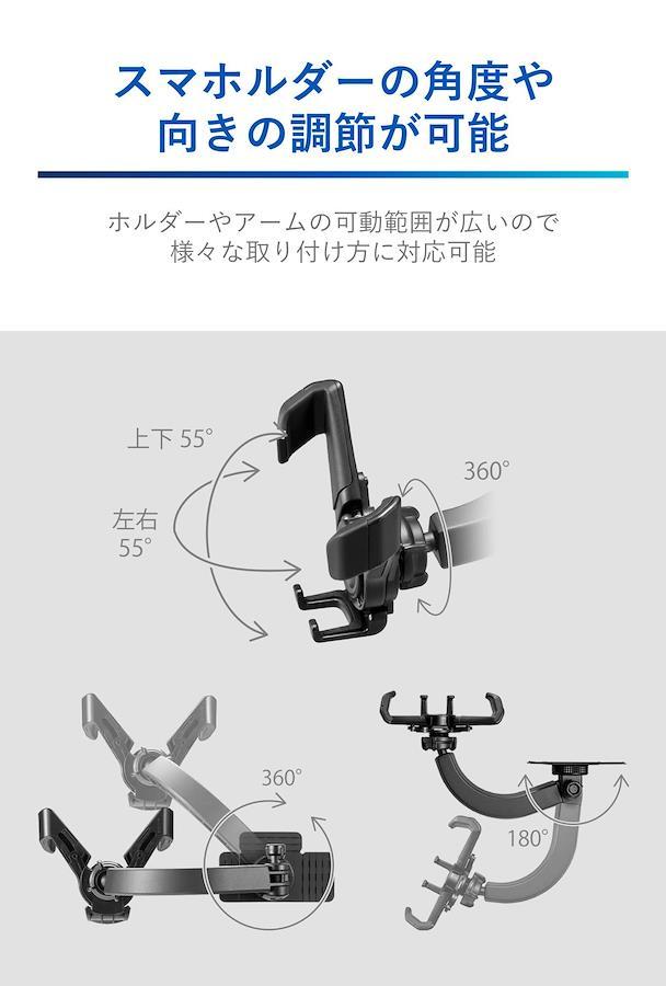 ●ホルダーの角度や向きの調節が可能・ホルダー部とベースをボールジョイントで接合することにより、上下左右55°角度調整ができます。また、ノブを緩めることでアームの角度を水平方向に1