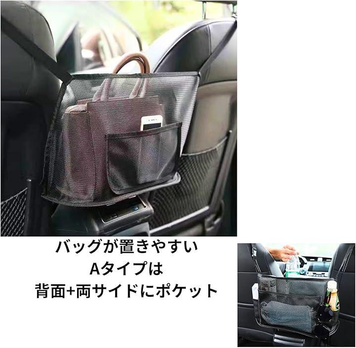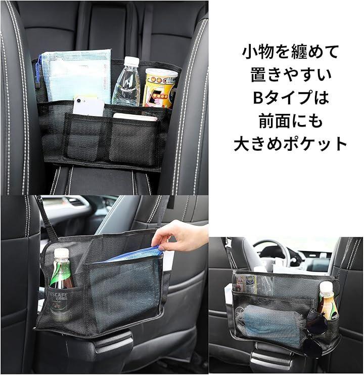 ボックス式とは違い、ネット式なので後席への圧迫感が少なく、A型はカバンの出し入れがしやすい浅型で背面ポケット付き、小物入れに使いやすい深めのB型はティッシュケースに使えるセンターのポケットを全面と後面にティッシュケースに使えるセンターのポケットを全面と後面に、スマホなどが収納できる両サイドポケットの4ポケット仕様です。