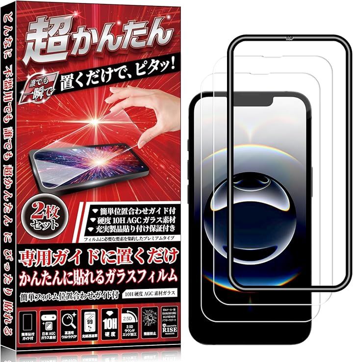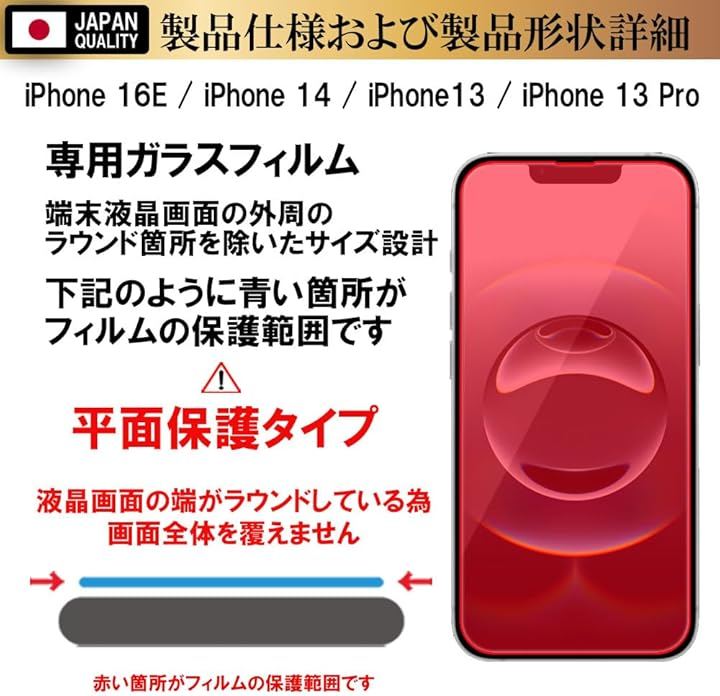 ***「対応機種」:iPhone 16E/14/13/13 Pro アイフォン 16E /14 / 13/ 13 Pro「セット内容」:ガラスフィルム x 2枚、かんたん位置合わせガイド枠 x 1個、 WETワイプ x 2枚、DRYワイプ x 2枚、ホコリ除去シール x 2枚、クリーニングクロス x 1枚、スクレーパー(ヘラ) x 1個。