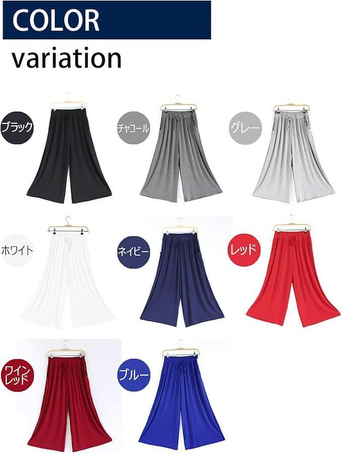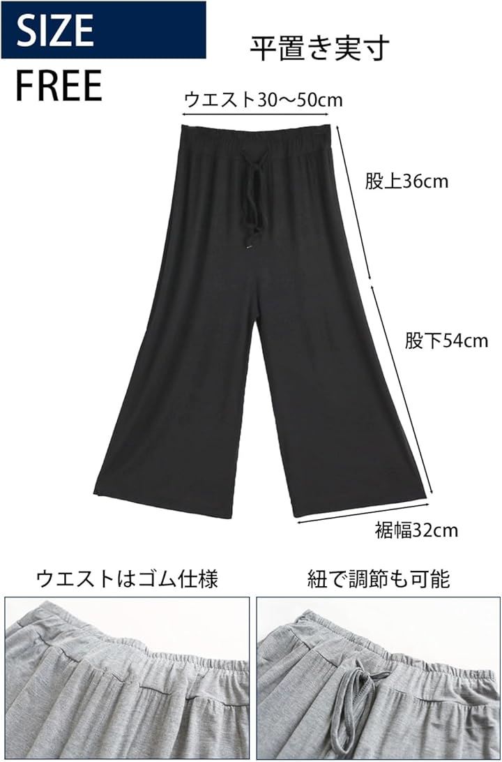 サイズ(平置き実寸):「フリーサイズ」 ウエスト(ゴム仕様)30~50cm 股上36cm股下54cm ヒップ58cm 裾幅 32cm 素材:モダール95% スパンデックス5% *モダール:レーヨン生地の一種、シルクに似た合成繊維。
