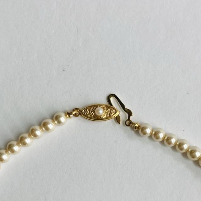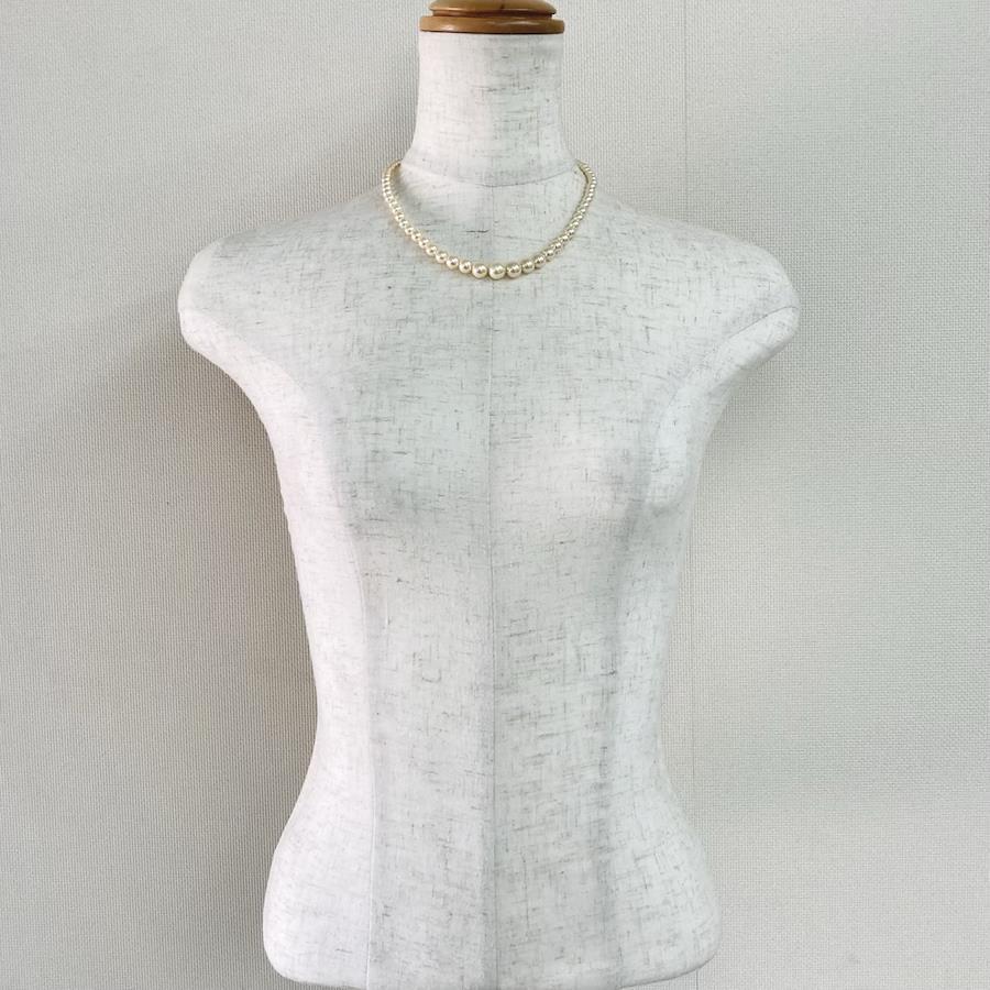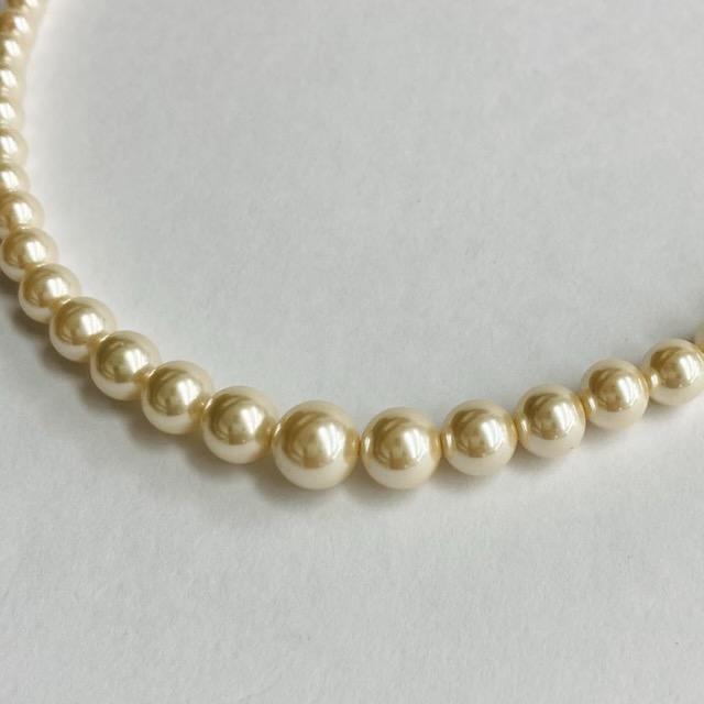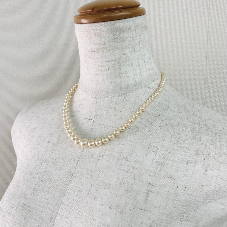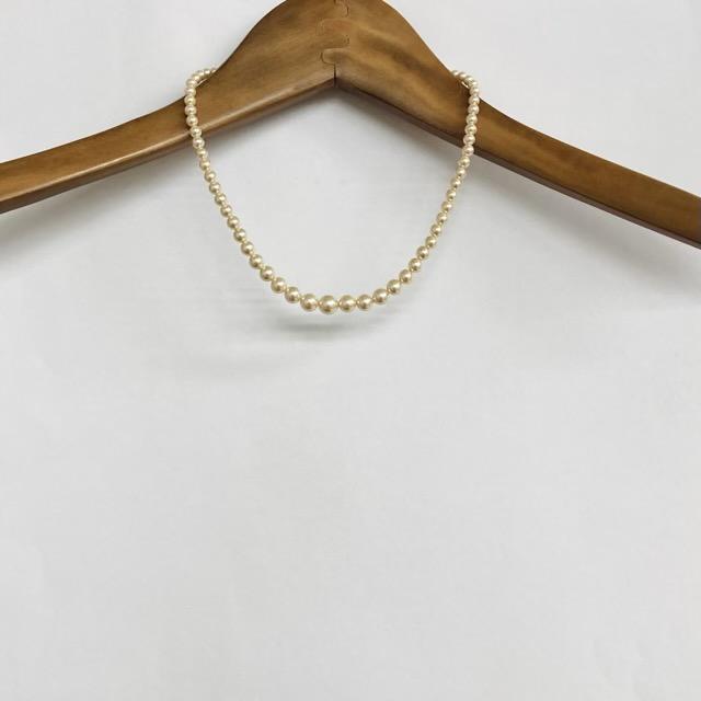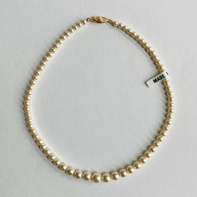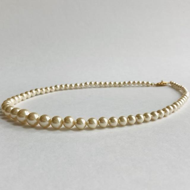 こちらはガラス素材の原玉を使用したオリジナル日本製ガラスパールネックレスです。パールサイズは直径約5mm~10mmサイズのパールをグラデーションに通し、長さは全長約43cmと標準的なプリンセスサイズになっております。ガラスパール特有のきめ細やかな質感と高級感漂うわずかな重みが特徴で、シンプルながら上品さのあるネックレスになっております。パールは当店のオリジナルカラーパールで、スタンダードなクリームパールを使用しております。※原玉にはピンホールや小さい凹み等が見られる場合がございますが、自社にて検品の上許容範囲とさせて頂いております。