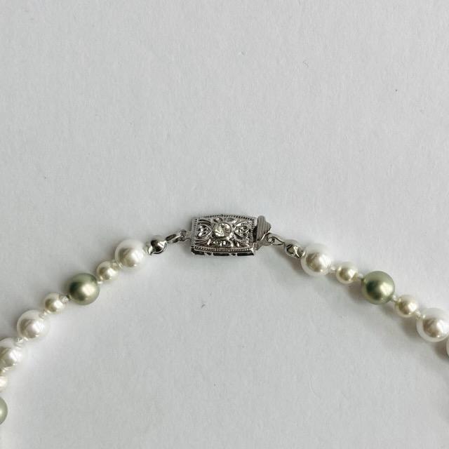 パールは当店のオリジナルカラーで、きめ細かい質感と程良い艶感のグリーン系カラーとホワイトカラーのmixとなっております。※原玉にはピンホールや小さい凹み等が見られる場合がございますが、自社にて検品の上許容範囲とさせて頂いております。