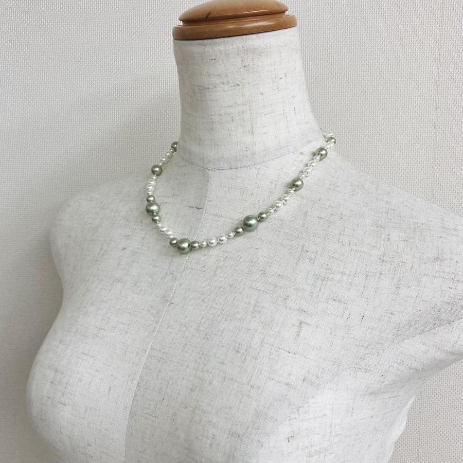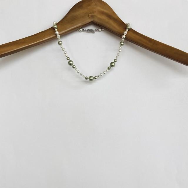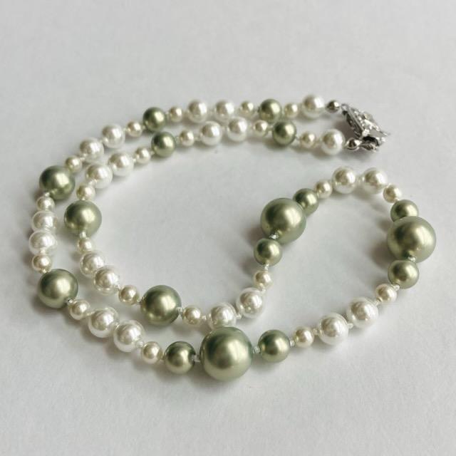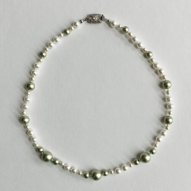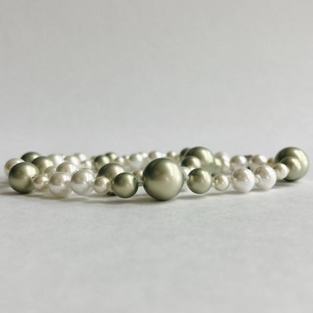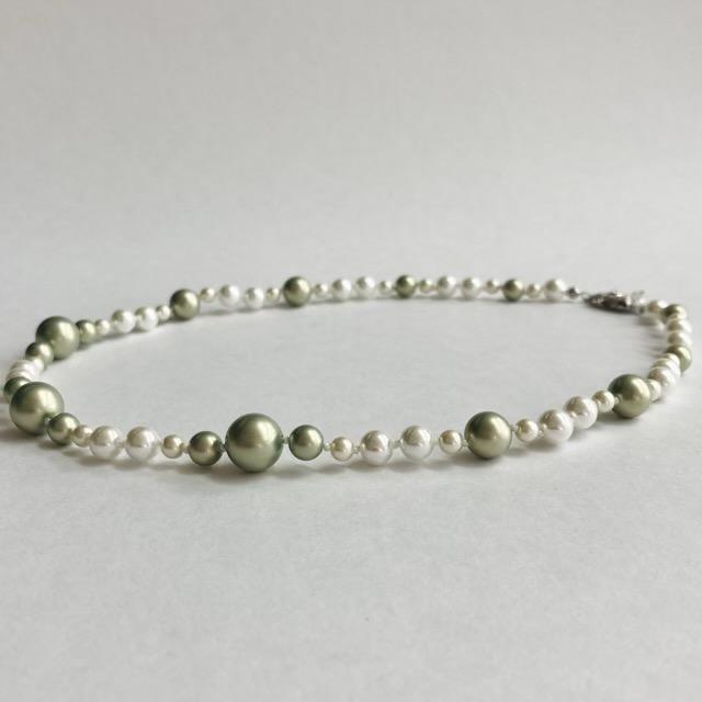 ガラスパールランダムmix all knotネックレス/6x10mm約43cm/グリーンxホワイト/made in japan