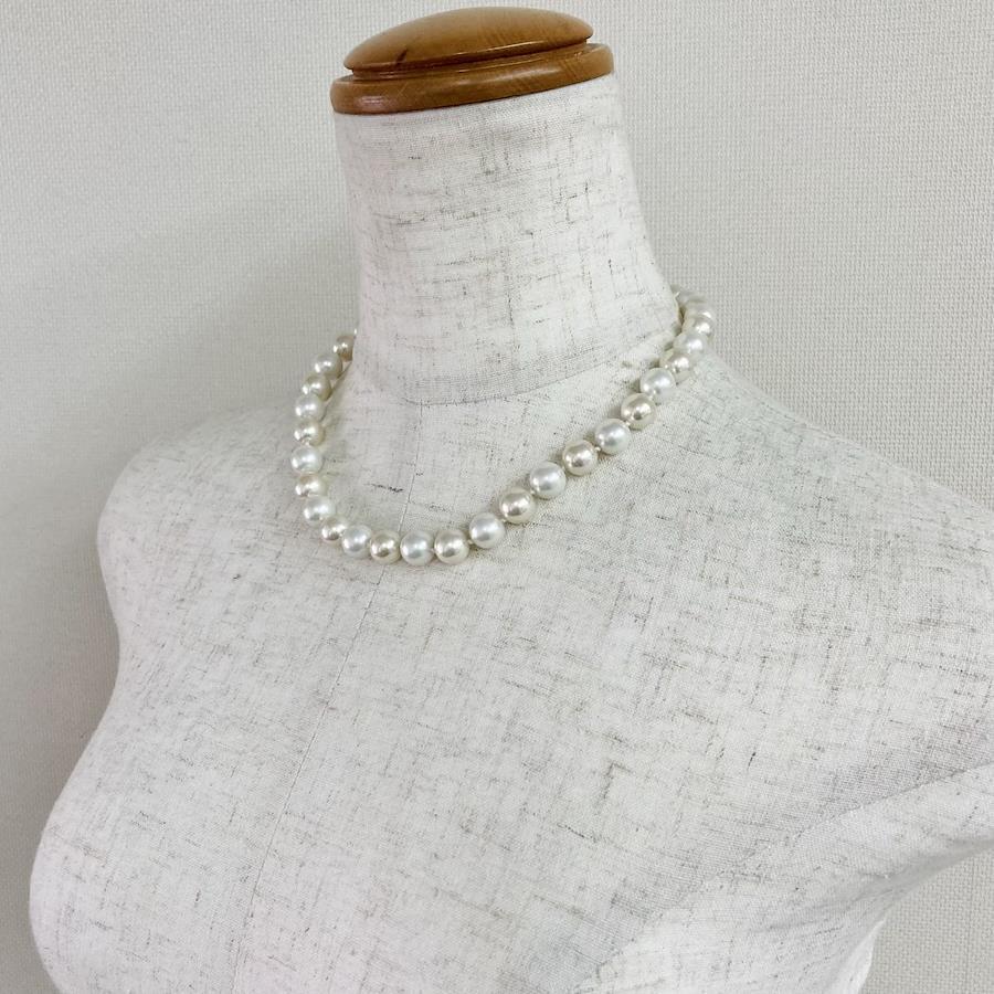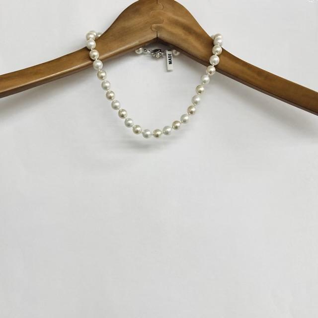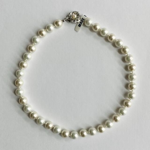 こちらはガラス素材の原玉を使用したオリジナル日本製ガラスパールネックレスです。パールとパールの間に1つづつ結び目を入れたオールノット仕様で、ワンランク上のコスチュームジュエリーとなっております。パールサイズはやや大粒の直径約10mmサイズで、長さは全長約43cmと標準的なプリンセスサイズになっております。ガラスパール特有の高級感漂う重みとオールノット仕様で存在感のあるネックレスになっております。※オールノット加工は、玉同士に隙間があるため擦れ合いにくく・キズなどが付きにくい、又、結び目があることで動きがありしなやかさもある、更に、万が一糸が切れてしまった時でも最小限で抑えられる等が特徴です。