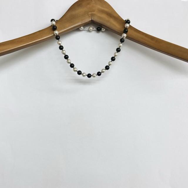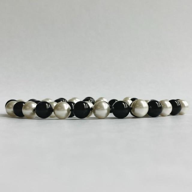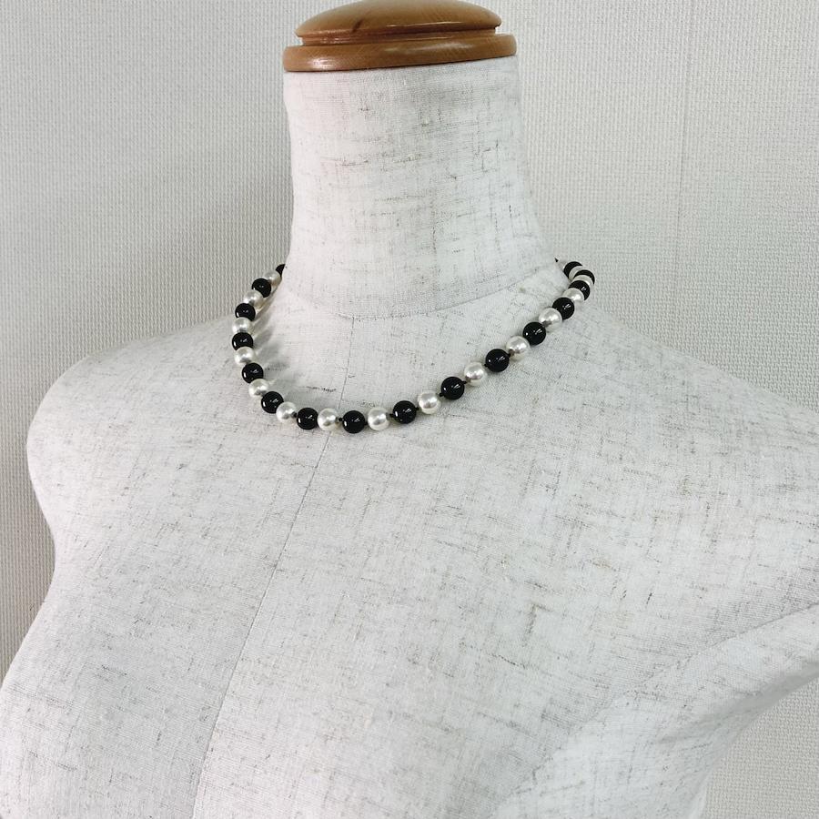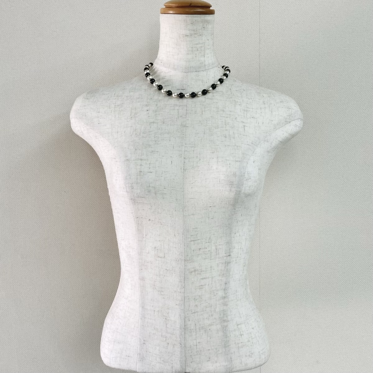 こちらはガラス素材の原玉を使用した日本製ガラスパールネックレスになります。パールの間1つ1つに結び目を入れたオールノット加工を施しております。パールサイズはスタンダードな直径約8mm玉で、長さは標準的なプリンセスサイズの全長約42cm。パールカラーはホワイトパールとブラックパールをコンビにして使用。
