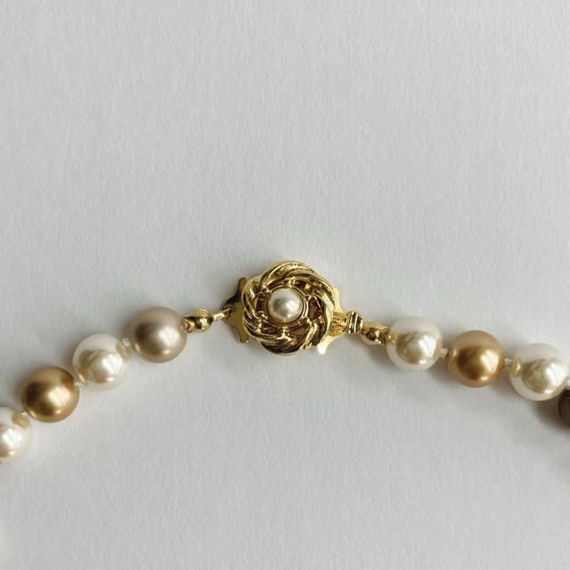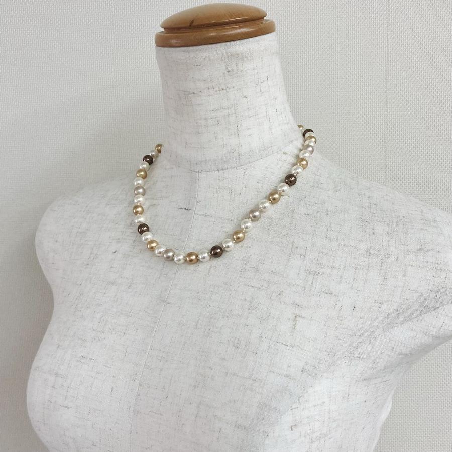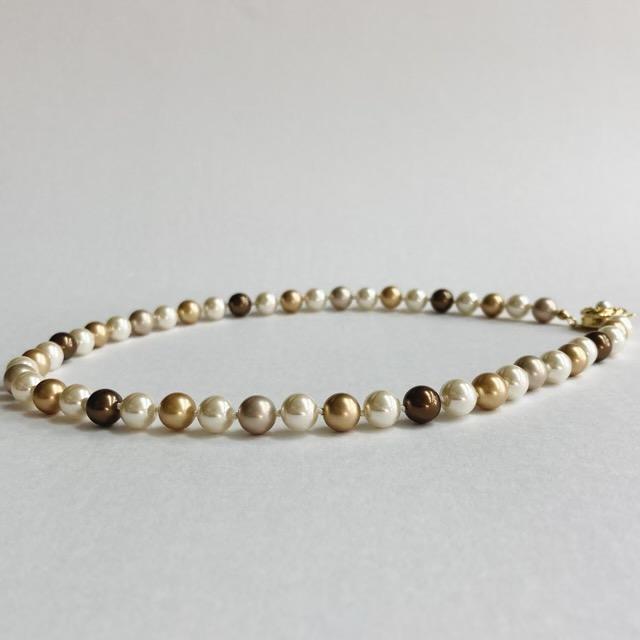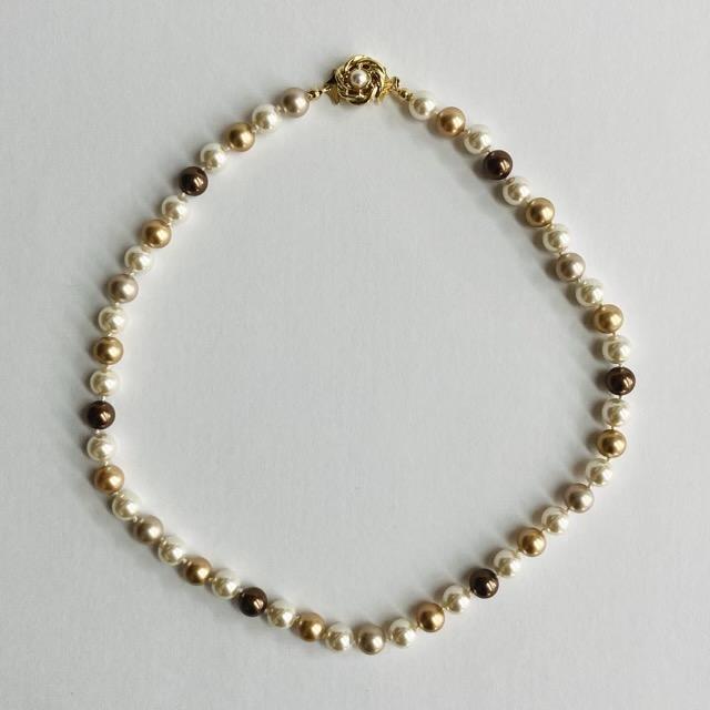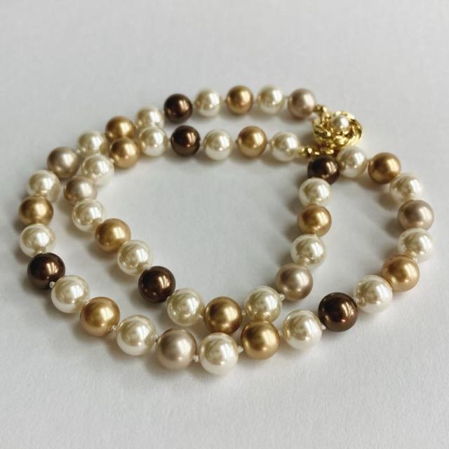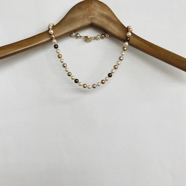 パールは当店のオリジナルカラーで、きめ細かい質感と程良い艶感が特徴のブラウン計パール各種をmixして使用しております。※原玉にはピンホールや小さい凹み等が見られる場合がございますが、自社にて検品の上許容範囲とさせて頂いております。