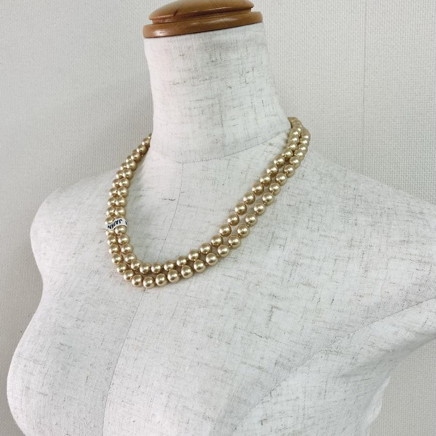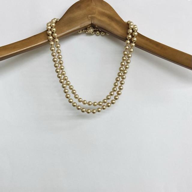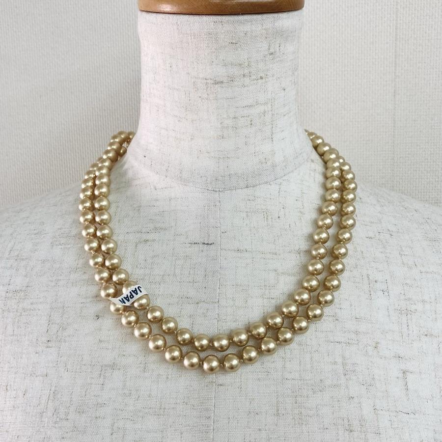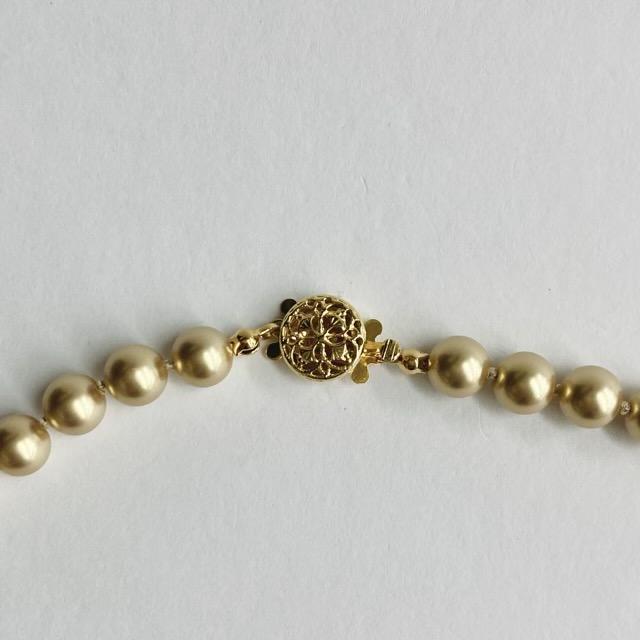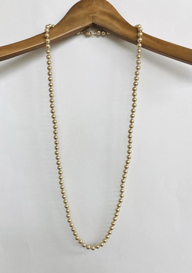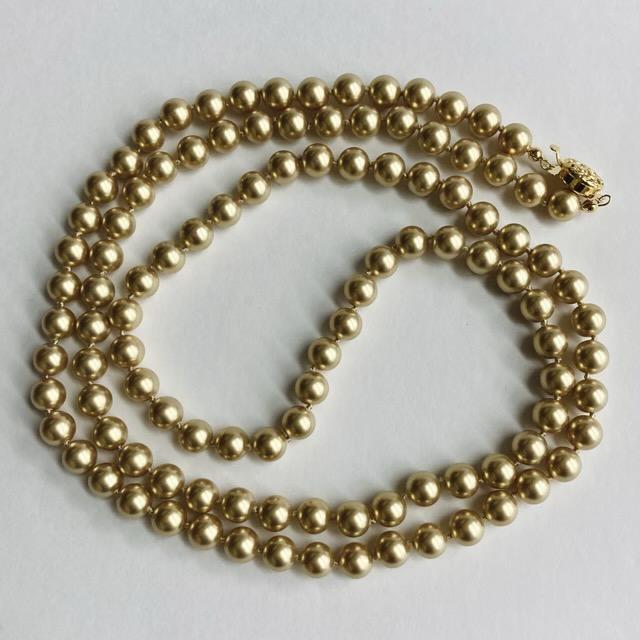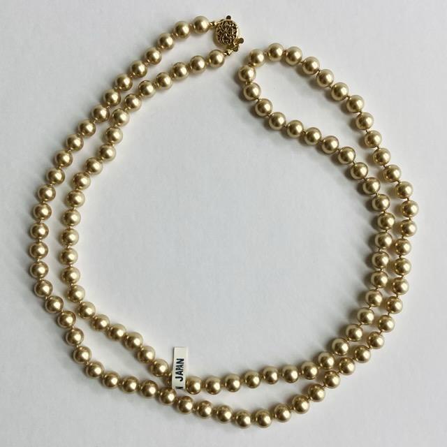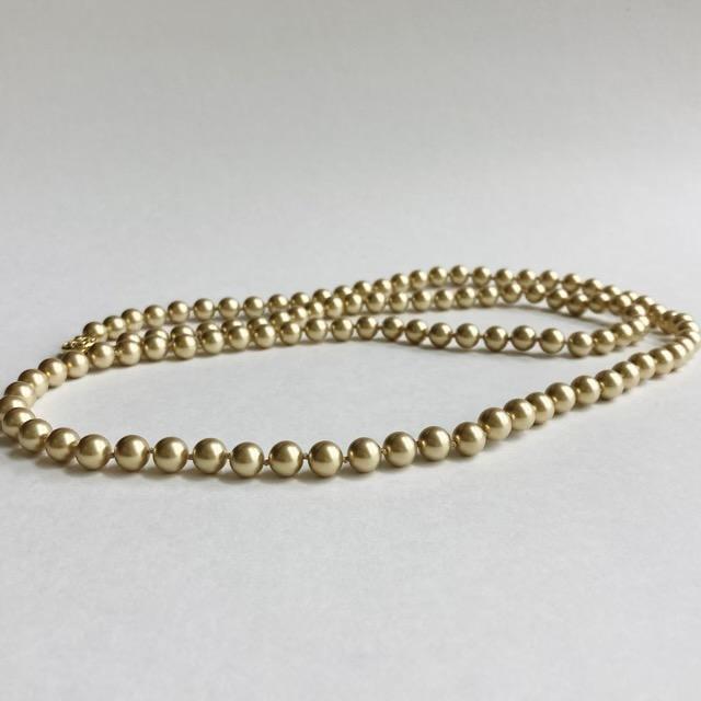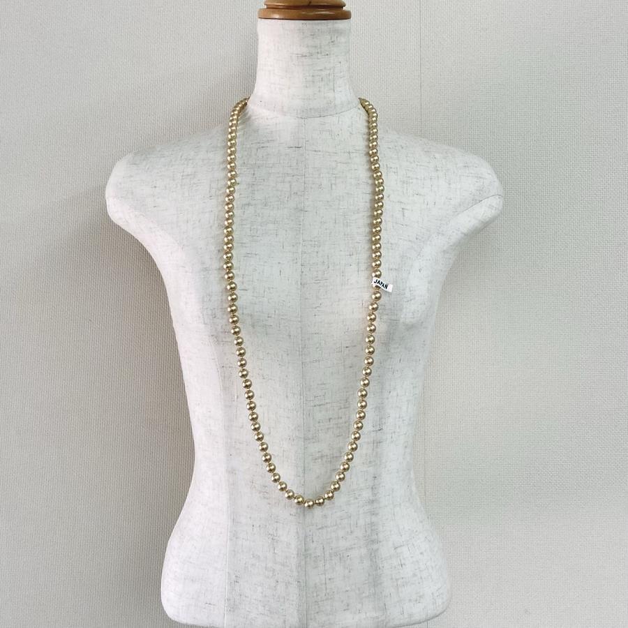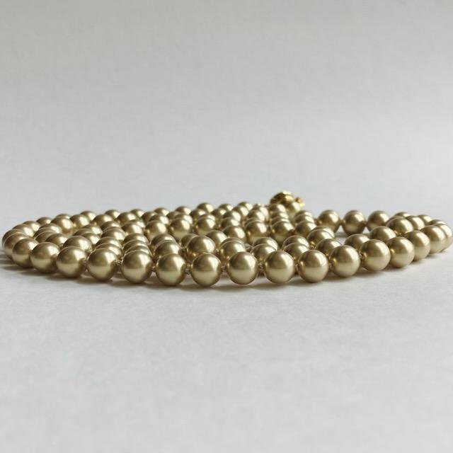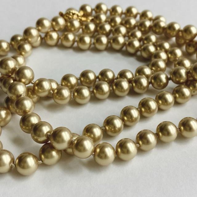こちらはガラス素材の原玉を使用した日本製ガラスパールネックレスになります。パールの間1つ1つに結び目を入れたオールノット加工を施しております。パールサイズはスタンダードな直径約8mm玉で、長さはかなり長めの全長約100cm。1連ロングネックレス・2連ネックレス等アレンジも可能です。パールカラーは、きめ細かい質感と抑え目の艶感が特徴のゴールドパールを使用。